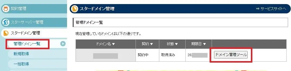 スタードメインの契約一覧から移管するドメインの「ドメイン管理ツール」をクリック